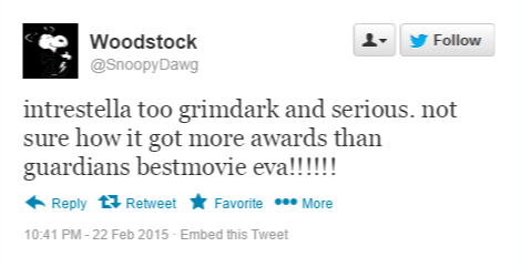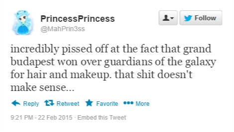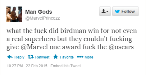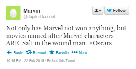 These are just some of the reactions from fans as Marvel was unable to take home anything at the Academy Awards (though fans can’t take solace in a victory for Big Hero 6). While Guardians of the Galaxy was up for two Oscars, it was  unable to walk out of the Dolby Theater with any accolades. Ruffling some feathers of the most adamant Marvel fans.